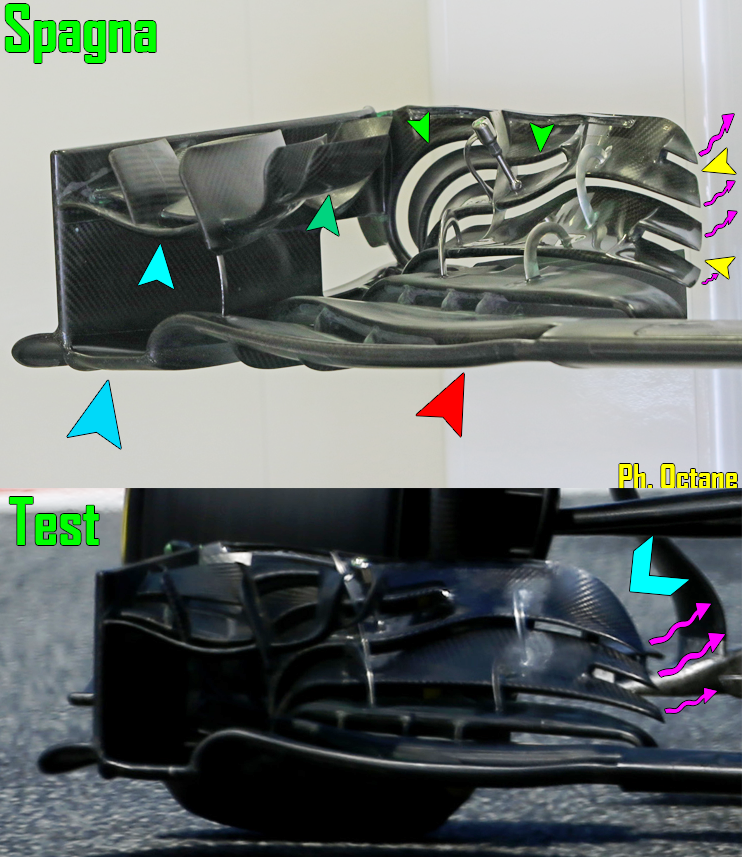 E' molto probabile che la nuova ala anteriore portata in Spagna è risultata fin troppo complessa tanto da portare il Team inglese ad un piccolo ridimensionamento, utilizzando una soluzione più tradizionale nella parte alta dell'ala anteriore.