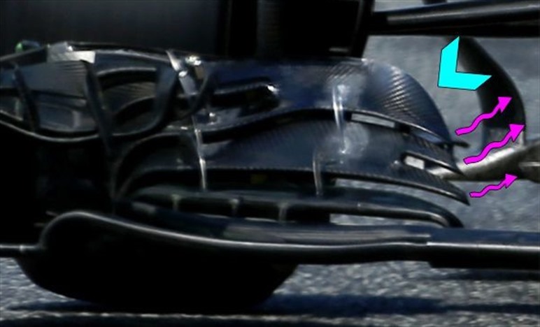 Quei piccoli quattro denti ben visibili nella foto in alto sono utili per generare quegli importanti vortici chiamati "Y250" (in viola). E' proprio dall'intensità e la qualità di questi vortici che dipende molto della generazione di carico aerodinamico tra parte centrale e soprattutto finale della vettura. Ed è proprio per questo motivo che la Mclaren non ha voluto portare già due versioni di ala anteriore in Spagna. Il Team di Woking ha voluto acquisire in tutte le sessioni del weekend molti dati riguardanti la nuova ala anteriore senza portare entrambi i piloti su quella che poteva anche essere una strada sbagliata.