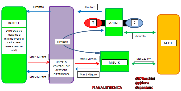 Tornando alla Formula 1, sappiamo per regolamento che in un singolo giro le vetture possono recuperare al massimo 2 MJ dal motore MGU-K; ciò che però non è regolamentato è il recupero di energia da MGU-H che nello schema in basso abbiamo effettivamente definito come "recupero illimitato" perchè è effettivamente così.