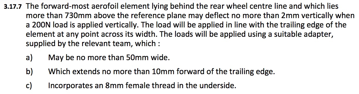 Per quanto riguarda Ferrari, sono piuttosto tranquilli. Gli articoli 3.17.6/7 sono chiari: l'ala posteriore non deve flettersi più di 5 mm in orizzontale una volta applicato un carico orizzontale di 500N (50 kg) e 2 mm verticalmente quando un carico 200N (20 kg) viene applicato in verticale. Test statici passati sempre brillantemente dal Team di Maranello: è quindi chiaro che l'ala posteriore della Ferrari, per come è scritto attualmente il regolamento, è chiaramente regolare.