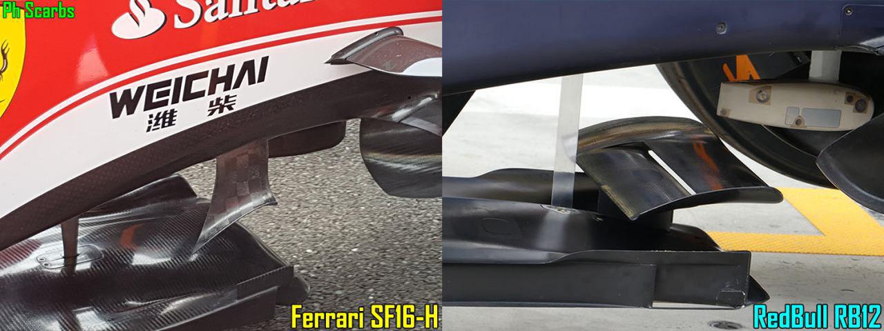 Sulla Ferrari SF16-H è stata introdotta una piccola novità nella zona del T-Tray. Come potete osservare dal confronto in basso sono state collocate delle piccole "alette", una per lato della vettura, poco prima dell'inizio del fondo con scopo di deviare verso il basso il flusso d'aria che le investe.