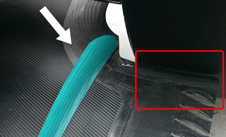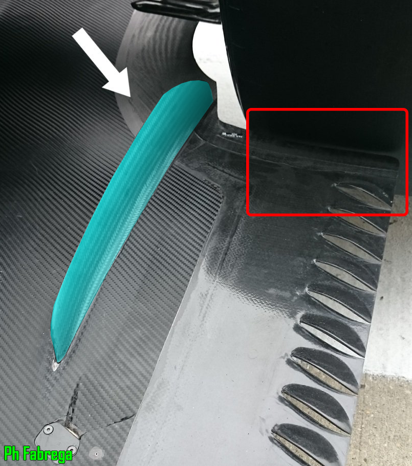 La prima modifica è da ricercare nella parte terminale del fondo dove nella nuova specifica sono tornati i ben 15 slot obliqui contro gli 11 slot obliqui più 2 slot ad L (erano nel riquadro rosso) della vecchia specifica testata durante il Gran Premio d'Austria. La funzione di tali slot è quella di evitare che il flusso diretto verso il diffusore interagisca nocivamente con le turbolenze che si creano con le deformazioni della gomma quando questa è sottoposta a carichi trasversali o longitudinali.