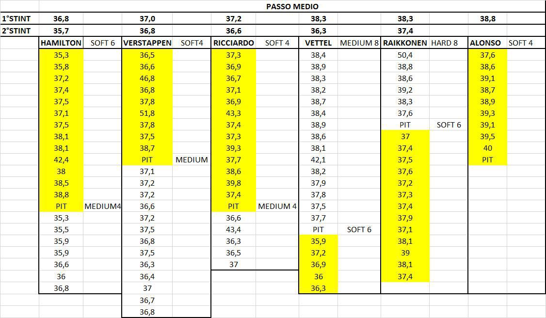 Concludendo, vorremmo accennare ad un qualcosa che potrebbe anche avversarsi nella giornata di domenica e a cui stiamo cercando ulteriori informazioni: secondo noi non è cosi improbabile che anche qualche Top Driver possa tentare nella gara di domenica una strategia a singola sosta (SOFT - MEDIUM), che mostrerebbe una chiara scelta troppo conservativa del costruttore di pneumatici italo cinese.