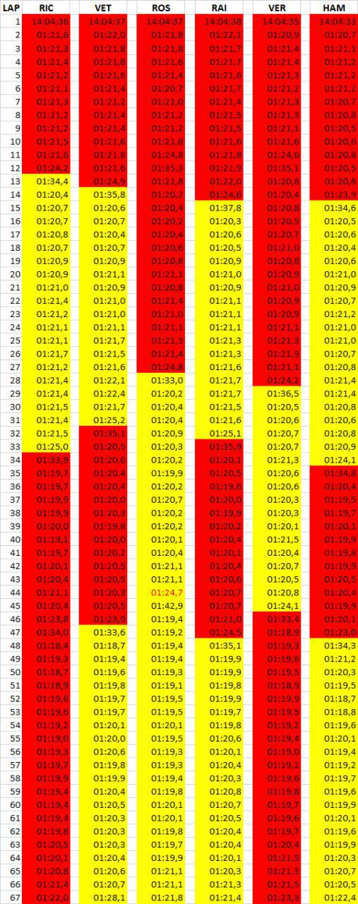 Per quanto riguarda la lotta di testa, Hamilton, grazie ad una partenza impeccabile, ha dominato la gara controllandola in maniera agevole. Analizzando i passi sembra che il tre volte campione del mondo non abbia nemmeno spinto al massimo la propria W07 cercando di salvaguardare al massimo la Power Unit che aveva raggiunto un chilometraggio importante.