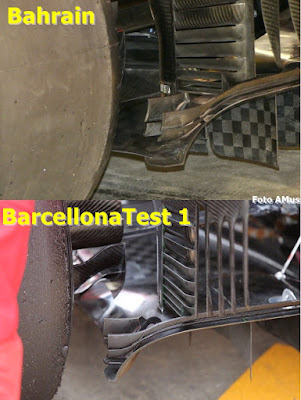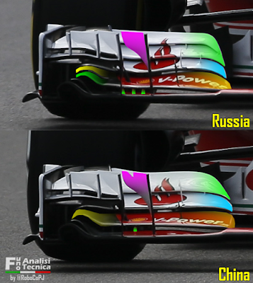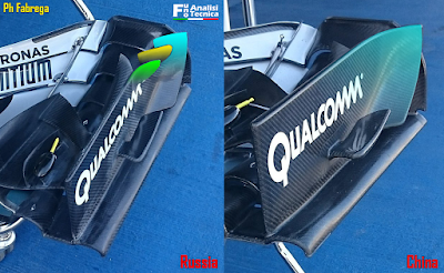 Durante le prove libere è stata utilizzata una nuova versione di ala anteriore modificata, rispetto alla precedente, nella zona degli endplate. Come potete osservare dal confronto la nuova versione di endplate differisce dalla precedente nella parte terminale in quanto la deriva verticale, nella zona più vicina agli pneumatici anteriori, è stata modificata introducendo due piccoli sfoghi creati da un piccolo profilo incurvato. Tali modifiche hanno lo scopo di energizzare e direzionare una maggior quantità di aria proveniente dall'interno dell'ala prima di essere deviato esternamente agli pneumatici.