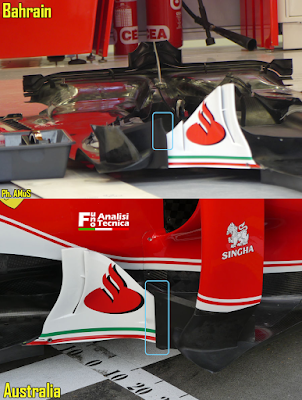 Come potete osservare dal confronto in alto, è stato modificato parte del bordo di attacco del primo deviatore di flusso di colore nero mentre quelli di colore bianco sono rimasti invariati. Gli ingegneri di Maranello, con questa leggera modifica hanno cercato di migliorare lo scorrimento dei flussi lungo le fiancate della vettura. Flusso che poi andrà ad interagire con la parte terminale della vettura.