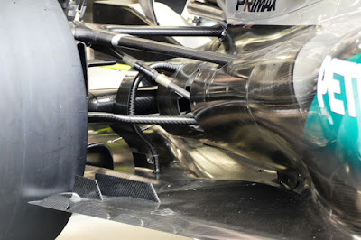 Questa zona, come mi abbiamo spiegato più volte, è molto critica poiché una delle problematiche che si riscontrano su vetture che usano un assetto rialzato al posteriore è che un distacco eccessivo del fondo dal suolo comporta una perdita di effetto suolo in quanto si va ad ampliare eccessivamente la sezione di passaggio dell'aria tra il suolo e il fondo. Di conseguenza si ha un flusso d'aria più lento, minor depressione oltre ad poter esserci l'ingresso di flussi laterali dall'esterno.Per quanto riguarda la Merceds, la squadra tedesca è arrivata in Bahrain con la stessa configurazione aerodinamica del GP di Melbourne.