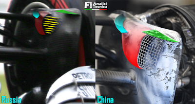 La Mercedes non ha portato grosse evoluzioni Russia ma ha in parte continuato ad affinare alcune soluzioni portate in pista nei primi appuntamenti stagionali. La prima è relativa alle prese d'aria dei freni anteriori che sono state ulteriormente modificate. Si è tornati alla versione pre Gran Premio del Bahrain con la presa d'aria vera e propria di dimensioni leggermente minori. Ma la novità è situata anteriormente a ciò; come potete notare dall'immagine sopra mostrata è stata eliminata la rete metallica utile ad evitare l'ingresso nella presa d'aria di detriti che potrebbero creare notevoli problemi di raffreddamento ai freni anteriori. La rete metallica è stata sostituita con delle piccole lamine orizzontali che hanno la stessa funzione con il vantaggio di disturbare in maniera minore il flusso d'aria all'ingresso della presa.
