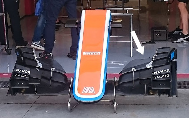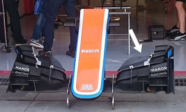Il Team Manor si è presentato a Monza con un'ala anteriore da basso carico che come potete vedere dalla foto in basso è priva dell'ultimo flap supplementare. Il Gp di Monza potrebbe essere una gara abbastanza buona per il team Manor in quanto può contare sulla Power Unit Mercedes e su una vettura che ha un ottima velocità di punta.
