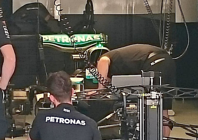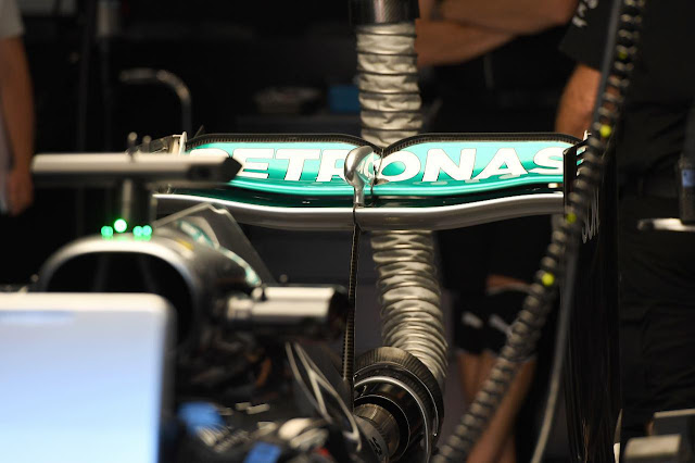 Durante le verifiche tecniche, su entrambe le W07 Hybrid era montata l'ala a cucchiaio che la funzione di concentrare il carico nella zona centrale scaricando le zone esterne. Anche il flap mobile segue ovviamente le linee del profilo principale e presenta un "taglio" a V nella zona centrale. Sugli endplate le soffiature nella parte alta sono diventate 4 ed è stata confermata la doppia soffiatura verticale sul bordo d'ingresso.