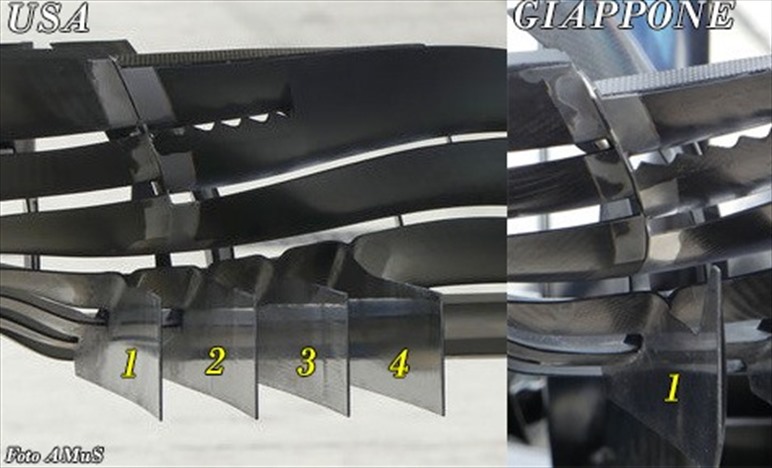 Confermati i grandi "denti di sega" (rispetto a quelli utilizzati per esempio dalla Ferrari) su parte del penultimo flap dell'ala anteriore con lo scopo di ritardare il distacco della vena fluida sul dorso del penultimo flap, stabilizzando cosi il flusso in arrivo sul successivo flap (l'ultimo).
