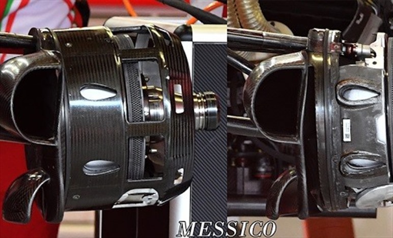 La Ferrari vista nei box del circuito Autodromo Hermanos Rodríguez del Messico presenta delle novità al sistema frenante anteriore legate all'elevata durezza del circuito messicano sull'impianto frenante. Ricordiamo che il nuovo circuito del Messico presenta ben tre frenate impegnative (curva 1, curva 4 e curva 12).