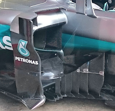 Bargeboard che diverranno fondamentali per cercare di sigillare maggiormente il più ampio diffusore permettendo cosi l'utilizzo di assetti rake sempre piuttosto spinti che miglioreranno in modo importante l'efficienza della nuova ala posteriore. Un'ala che per regolamento tecnico sarà larga ben 950 mm (contro i 750 mm della versione 2016) e con un'altezza limite di soli 800 mm al di sopra del piano di riferimento (contro i 950 mm della versione 2016). Ciò ci può indicare che l'ala posteriore in versione 2017 potrebbe risultare meno efficiente rispetto alla versione 2016 poiché essendo in una posizione più bassa potrebbe andare a raccogliere nella sua parte alta gran parte del flusso turbolento proveniente dell'anteriore della vettura.