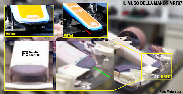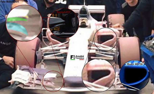 Come si può vedere dall'immagine in basso, sull'endplate dell'ala anteriore, simile alla prima versione utilizzata dal Team Manor nella stagione 2016 di Formula 1, è stato inserito un deviatore di flusso che occupa l'intera lunghezza dell'elemento. Questo particolare aerodinamico ha la funzionalità di spostare l'aria sopra lo pneumatico anteriore in modo da limitare le turbolenze del flusso d'aria diretto verso il posteriore della vettura, riducendo in parte la resistenza all'avanzamento.