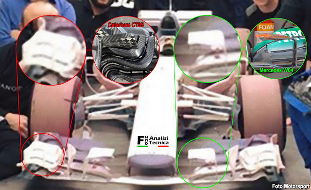 Gli aerodinamici guidati da Tombazis hanno lavorato molto duramente nella zona degli upper flap che rispetto alla vettura dello scorso anno sono molto più elaborati e sofisticati. Nella zona in prossimità dell'enplate i flap a sbalzo sono composti da 3 elementi direzionati verso l'esterno vettura e vengono sfruttati per deviare il flusso d'aria esternamente agli pneumatici anteriori. Oltre agli upper flap, sul profilo principale è stato posizionato un deviatore di flusso che ha la funzione di spostare il flusso d'aria esternamente agli pneumatici anteriori. Oltre a ciò è stato collocato un profilo ad L rovesciata, chiamato anche r-winglet, fondamentale per energizzare l'importante vortice Y250 . E' proprio dall'intensità e dalla qualità di questi vortici che dipende molto della generazione di carico aerodinamico tra parte centrale e soprattutto finale della vettura. l'andamento di questi vortici. Questa soluzione non si può consIderare come innovativa in quanto era già stata utilizzata nel 2013 sulla Mercedes W04. Ultima soluzione interessante è l'innalzamento della parte interna dei flap superiori, in stile Renault R31, per generare un vortice Y250 più alto e più coerente in relazione ai più importanti in dimensioni bargeboard posizionati a metà vettura.