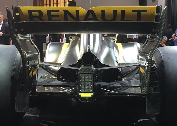 Al posteriore è confermato anche sulla Renault l'utilizzo della pinna stabilizzatrice per cercare di "ripulire" il flusso d'aria diretto verso la bassa ala specifica 2017. Da notare nell'immagine 9 anche la forma affusolata dell'airscope per fini prettamente aerodinamici, già spiegati in precedenza.