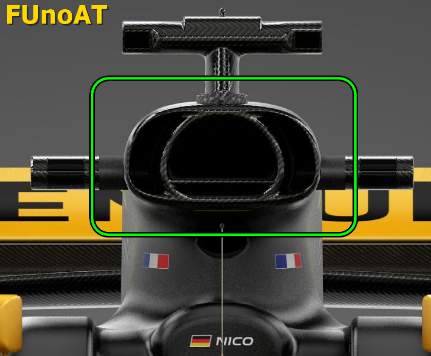 Passando alla parte centrale della monoposto è facile partire nell'analizzare una delle soluzioni secondo noi migliori di questa R.S.17 ossia l'airbox. Componente che i tecnici francesi hanno completamente rivisto e suddiviso in quattro zone ben distinte: il condotto più grande alimenta il compressore mentre la parte inferiore è dedicata al raffreddamento di un altro componente. I due segmenti laterali alimentano invece i radiatori che raffreddano i due motori elettrici, MGU-H e MGU-K. Da segnalare che poi vi è un altro condotto appena sotto la parte principale dell'airbox che ha di nuovo funzioni di raffreddamento.