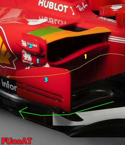 L'innovazione di cui parliamo anche nel titolo dell'articolo sta nel pensare di posizionare un grosso deviatore di flusso che riduce la sezione di ingresso soprattutto nella parte interna della vettura ma che riesce a garantire un maggior afflusso d'aria verso la parte terminale e superiore del fondo vettura (freccia gialla in basso). Con la Ferrari che si è tenuta comunque la possibilità di togliere questo grande deviatore (o evolverlo), segnalato con il numero 1 in giallo nell'immagine in basso, tornando ad una soluzione più convenzionale simil SF16-H.