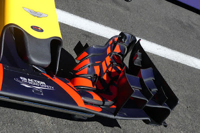 Sempre parlando di scalino sul telaio, per riuscire ad installare una versione più complessa ma probabilmente redditizia di terso elemento sospensivo anteriore, si può notare dall'immagine rilasciata dalla RedBull che sopra il terzo elemento è presente una protuberanza come se l'ingombro di quest'ultimo elemento sia più ampio dello spazio che RedBull aveva verticalmente per l'installazione. Con le frecce blu abbiamo voluto mettere in evidenza l'aria che fuoriesce dallo sfogo dell'S Duct.