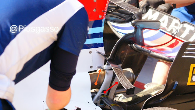 Stiamo parlando di una seconda T Wing (freccia rossa) montata sul posteriore della FW40 in una posizione però, ad ora, inedita. Cosi come l'aletta montata sulla pinna, anche quella installata nella parte bassa del cofano motore ha dei supporti curvi (freccia arancio) per limitare le tante, forse troppe, vibrazioni. Componente che che pur andando a generare portanza (guardare la curvatura del profilo) e quindi resistenza all'avanzamento, dovrebbe però migliorare anche la generazione di carico aerodinamico al posteriore andando a massimizzare il delta di pressione tra dorso e ventre dell'ala posteriore.