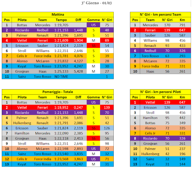 Ciò che i test hanno fin dal primissimo giorno confermato è che la nuovissima Power Unit Renault è tutt'altro che affidabile (sound molto più pieno rispetto alle Power Unit di Ferrari e Mercedes), confermando i nostri rumors di qualche settimana fa. Questo non è un problema da poco poiché analizzando il chilometraggio si può notare come il Team anglo austriaco abbia percorso quasi la metà dei chilometri Mercedes e circa 800 km in meno di Ferrari quando sappiamo che soprattutto in questi primissimi test è importante essere in pista il più possibile. In questa stagione 2017 sarà fondamentale evolvere correttamente le vetture: riuscire quindi a portare in fabbrica quanti più dati possibili in questa otto giorni di test consentirà ai Team di procedere con la validazione dei primi aggiornamenti da portare in pista all'inizio della stagione e soprattutto di pianificare quelli che verranno introdotti tra la seconda parte delle gare europee e l'ultima parte di stagione.