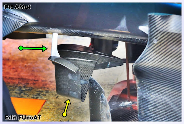 E' interessante notare come Mercedes sta utilizzando una sorta di endplate (in giallo nella prima immagine) sulla sua BatWing 2017 Spec fissati al telaio della W08 tramite dei supporti in titanio (in verde nella prima immagine). Ciò per evitare che il componente si deformi troppo alle alte velocità e alle alte forze centrifughe presenti in questo 2017 in curva.