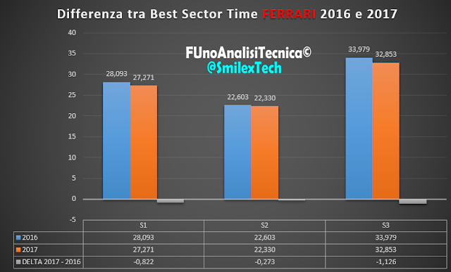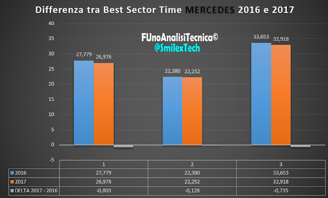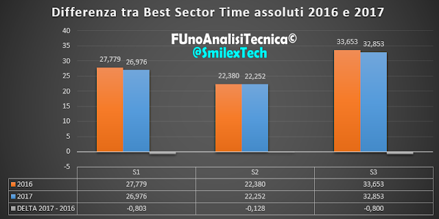 Nel prossimo grafico a barre si possono notare invece i miglioramenti tra i Best Sector Time fatti segnare nel 2016 (Hamilton S1, Hamilton S2 e Rosberg S3) rispetto ai migliori tempi 2017 (Hamilton S1, Bottas S2 e Vettel S3).