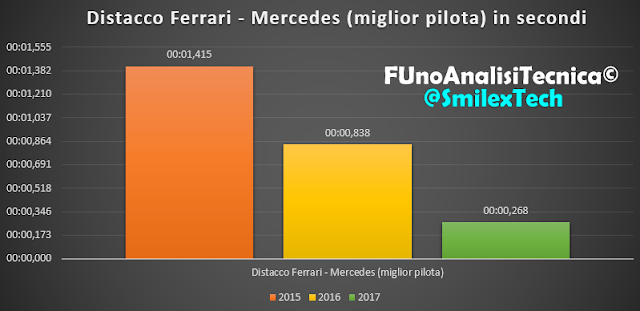 Ma la stagione 2017 è anche quella dell'importante cambiamento regolamentare tecnico che doveva portare le vetture dell'anno corrente ad essere più veloci di circa 5-6 secondi rispetto a quelle del 2015, e di circa 3-4 secondi rispetto a quelle 2016. I prossimi due grafici vanno a mettere proprio in evidenza ciò: