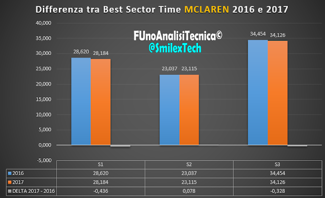 Per il Team Mclaren una qualifica "normale" che ha mostrato ancora quanto la Power Unit Honda sia palesemente in difficoltà. La MCL32, come potete vedere dal grafico, non ha migliorato il secondo settore della MP4-31 2016, il che lascia veramente allibiti. Purtroppo per il Team inglese ci sarà da aspettare fino al prossimo mese di maggio per avere un aggiornamento della Power Unit giapponese anche se in molti addetti ai lavori si chiedono se il Team Mclaren riuscirà a pazientare fino a quella data.