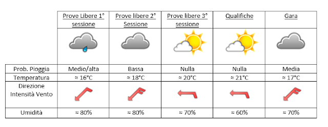 Prove libere 1° sessione, venerdì ore 4:00/5:30: prima sessione di prove libere che sarà caratterizzata da tempo instabile, con cieli quindi coperti con possibilità di pioggia. Precipitazioni che cadranno quasi sicuramente prima della sessione. Temperature intorno ai 15/16°C e venti deboli dai quadranti nord-orientali.