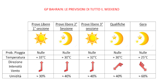 Prove libere 2° sessione, venerdì ore 17:00/18:30 (ora italiana): la seconda sessione vedrà ancora cieli sereni, con temperature in leggero calo grazie al calar della sera. Venti sempre deboli dai quadranti meridionali.