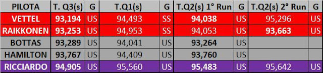 Analizzando la velocità sulla finish line e nel settore 2, Vettel, sembra avere una macchina leggermente più carica rispetto a quella del compagno di squadra. Questo maggior carico potrebbe essere importante durante la gara per una miglior gestione degli pneumatici. Per il tedesco sarà importante scattare nel migliore dei modi al via, in quanto, il lungo rettifilo potrebbe dare una grossa mano a Bottas che partendo anche lui dal lato pulito e avendo una migliore velocità di punta potrebbe dare qualche fastidio alle Rosse.