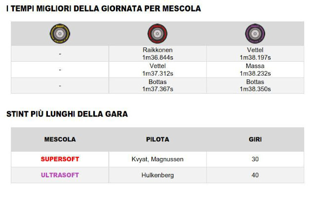 Vettel è rimasto in pista per sei giri in più rispetto a Bottas, cercando di sfruttare le gomme più nuove per raggiungerlo nelle fasi conclusive. I primi otto al traguardo hanno tutti utilizzato la stessa strategia con Ultrasoft al via e cambio su Supersoft.