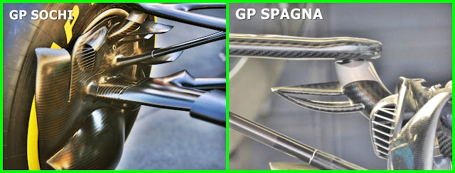Modifica di dettaglio anche nella sospensione anteriore dove il piccolo profilo collocato sul pivot, utilizzato per alzare il triangolo superiore, è stato diviso in due profili. Lavoro finalizzato per migliorare il flusso d'aria diretto verso la parte centrale e posteriore.