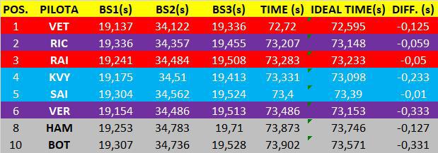 Nella tabella successiva sono indicati i Best Sectors di tutti i piloti di punta, compresi gli Ideal Lap. Verstappen e soprattutto Bottas sono i piloti che hanno pagato maggiormente il fatto di non aver messo insieme il giro migliore delle loro seconde prove libere.
