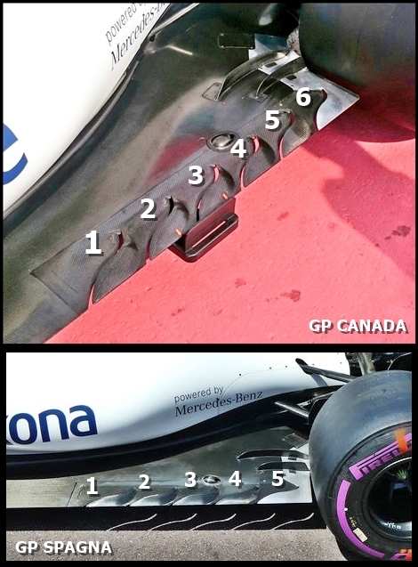 Oltre alla Ferrari SF70H anche la Williams ha introdotto delle novità nella parte terminale del fondo in prossimità degli pneumatici posteriori. Come potete osservare dal confronto in basso gli slot che vengono utilizzati per gestire nel migliore dei modi il fenomeno chiamato “tyre squirt” e sigillare parte del fondo e del diffusore sono diventati 6 contro i 5 presenti nelle prime sei gare stagionali.