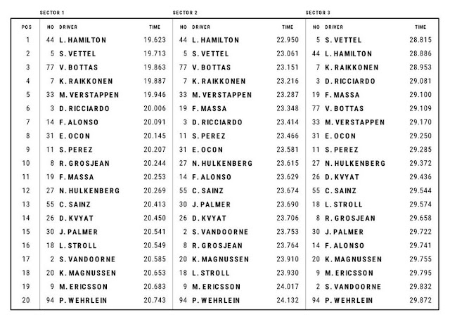 Guardando la tabella dei miglior settori fatti segnare dai Top Driver si può vedere come Hamilton abbia fatto la differenza rispetto a Vettel nei primi due settori, più guidati, pagando qualche centesimo di secondo invece nel terzo settore, il più veloce vista la presenza di un lunghissimo rettilineo. Parlando di terzo settore, Vettel e la Ferrari sono stati molto competitivi durante tutto il weekend anche grazie ad una Power Unit che ora, dopo l'aggiornamento portato in Spagna, può contare su una potenza massima leggermente superiore a quella della Power Unit Mercedes.