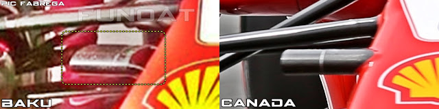 Come si può ben vedere dall'immagine confronto FUnoAT in alto, è stata introdotta una soffiatura nella parte interna delle telecamere FOM oltre ad una modifica anche nella forma dei supporti (ora più arrotondati). La soffiatura, utilizzata anche dagli altri competitors di Ferrari come Mercedes e RedBull, è utile per alleviare lo strato limite in formazione tra la parte esterna del muso e i supporti delle telecamere e quindi generare minor resistenza all'avanzamento. Senza contare che con la nuova forma, i supporti ora possono essere considerati dei veri e propri convogliatori di flusso.