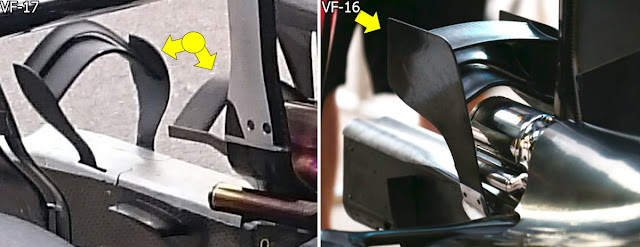 Il team Haas si è presentato alle verifiche tecniche con delle novità nella zona posteriore della VF-17. Come possiamo osservare dai confronti in basso è stato modificato il supporto dell'ala posteriore. Fino al Gp del Canada, gli aerodinamici Dallara, avevano utilizzato il monopilone,mentre, a partire da questo ottavo appuntamento stagionale hanno optato per il doppio pilone che, la Ferrari, sta utilizzando dall'inizio della stagione.