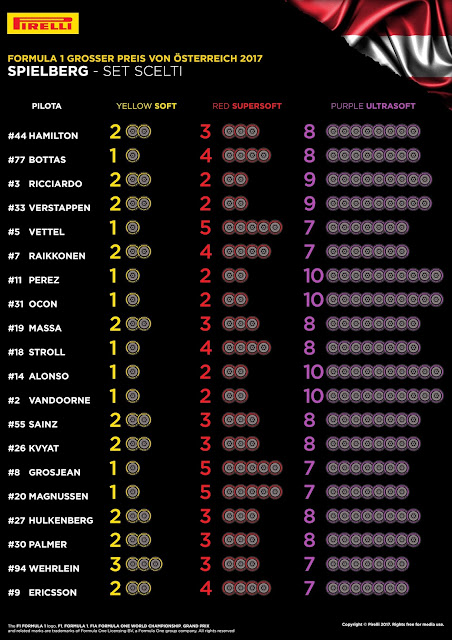 Riguardo all'immagine c'è da segnalare che sia Mercedes che Ferrari hanno optato per una differenziazione dei compound tra i due piloti cosi da riuscire a provare con un pilota durante il weekend il compound Soft. Per quanto riguarda il numero di compound a disposizione, la scelta Mercedes potrebbe essere la più bilanciata rispetto alle scelte effettuate da Ferrari e RedBull. Il Team italiano ha optato per una scelta molto conservativa con soli 7 treni di UltraSoft ma ben 5 di SuperSoft per Vettel (4 per Raikkonen). Mentre RedBull ha optato per una scelta completamente diversa optando per 10 set di UltraSoft e soli 2 di SuperSoft.