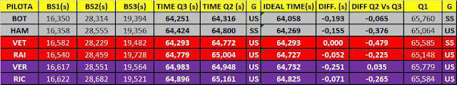 Nell'ultimo settore, Mercedes nuovamente superiore alla Ferrari (0.6%), con un Hamilton in grande spolvero rispetto ad un secondo settore veramente lento fatto segnare dal pilota inglese della Mercedes. Per Vettel non un gran tempo anche per via di una piccola sbavatura in uscita dall'ultima curva che gli ha fatto sicuramente perdere qualche centesimo di secondo. RedBull paga da Mercedes lo 0.9% con tempi non lontani da quelli di Ferrari.