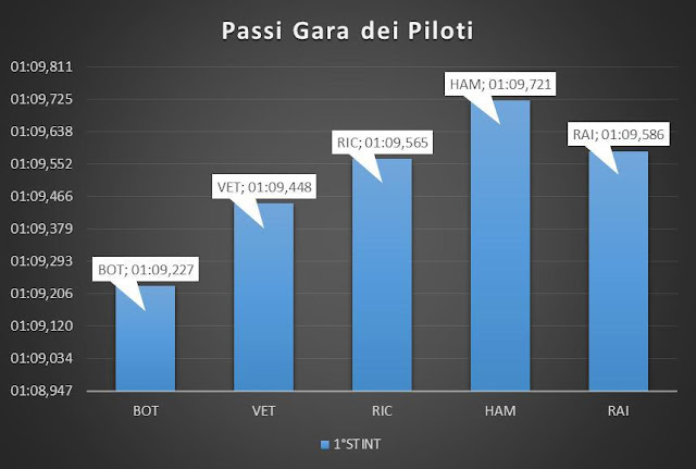 Stint che Vettel ha iniziato 6 giri prima ed è stato "macchiato" da un errore al giro 44 che ha fatto perdere 1,8s su Bottas. Tempo perso che risulterà fondamentale a fine gara vista la distanza a fine gara.