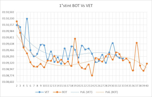 Vettel, anticipando lo stop, è riuscito a recuperare oltre il 50% del gap che aveva nei confronti di Bottas, il quale, non ha risposto subito al pit Ferrari ma ha preferito continuare per altri giri. Scelta che Mercedes non ha fatto casualmente ma, con molta probabilità, si aspettavano dei problemi con la gomma "rossa" e quindi hanno preferito proseguire con la US visto che i tempi erano ancora molto buoni ma superiori a quelli di Vettel che stava montando la SS nuova.