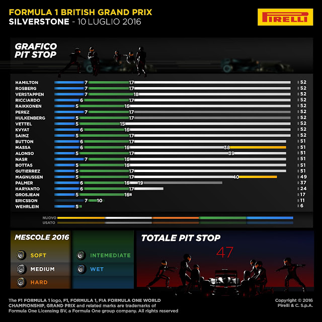 Per via della pioggia caduta poco prima del via del Gran Premio di Silverstone, le strategie dello scorso anno non sono significative anche se si può notare l'ottimo funzionamento della Medium che ha permesso a molti piloti di arrivare in fondo alla gara percorrendo 35 giri del lungo tracciato di Silverstone.