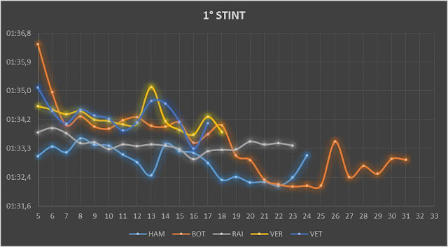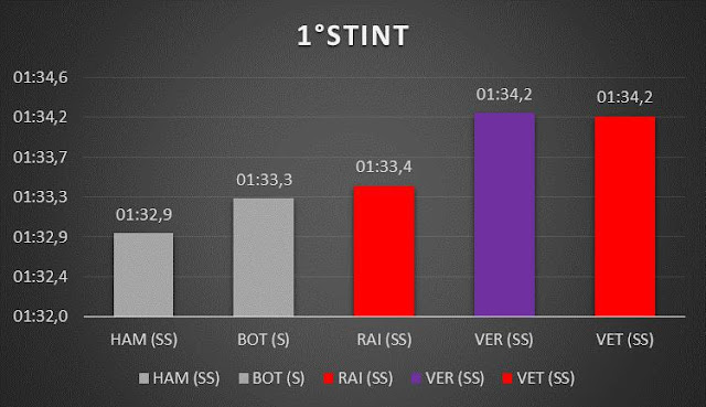 Se analizziamo il passo tenuto dai top 5 possiamo notare che, la Mercedes, sul tracciato di casa era praticamente imbattibile. Hamilton, sul ritmo, ha inflitto un gap di mezzo secondo al giro alla SF70H di Raikkonen e ben 1,3s al duo Verstappen-Vettel. L'unico pilota che è riuscito a "limitare i danni" è stato il compagno di team che, partito con le soft e nel traffico, è riuscito ad accusare un distacco di soli 4 decimi.