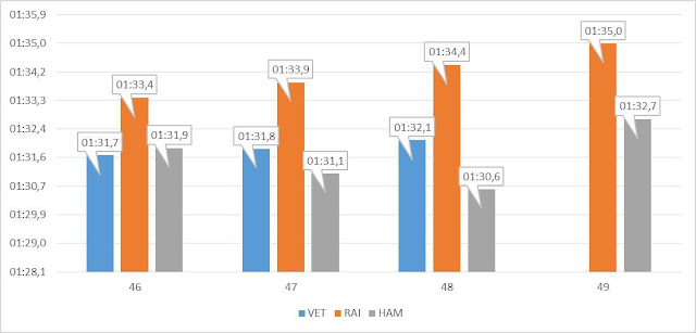 Nella seconda parte di gara, Hamilton, come potete osservare dal grafico in basso, ha spinto soltanto nella prima fase e poi ha semplicemente amministrato e gestito nel migliore dei modi pneumatici e Power Unit cercando di non stressarli oltremodo. Che Hamilton non abbia spinto al massimo lo si è capito al termine della gara quando ha voluto completare il suo week end perfetto andando a "prendersi" il giro più veloce della gara. Giro più veloce che è riuscito ad ottenere al giro 48 girando su un tempo stratosferico di 1:30,6 con gomme soft usate. Tempo che nemmeno Verstappen, che ha montato gomme super soft negli ultimi 2 giri di gara, è riuscito a battere.