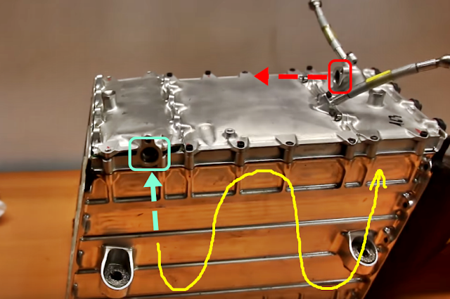 Per concludere una immagine che ci mostra anche l'ingresso dell'acqua refrigerante (freccia azzurra) e l'uscita (freccia rossa) con il percorso obbligato che il fluido è obbligato a percorrere all'interno dello scambiatore. Come si può ben vedere dalla freccia gialla, l'intercooler Ferrari 2014 e 2015 aveva per l'acqua ben quattro giri interni controcorrenti all'aria per massimizzare il coefficiente di scambio termico.