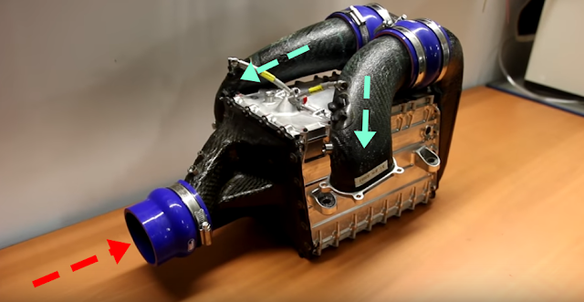 Facendo riferimento all'intercooler della Power Unit Ferrari 2014, una unità motrice che era costato il ruolo alla sua "mente" ossia l'ingegnere italiano Luca Marmorini, il lato aria è molto semplice. L'aria calda (freccia rossa) in uscita del compressore viene raffreddata all'interno dello scambiatore e se ne va verso l'aspirazione del motore endotermico tramite due condotti (frecce azzurre) in materiali compositi.