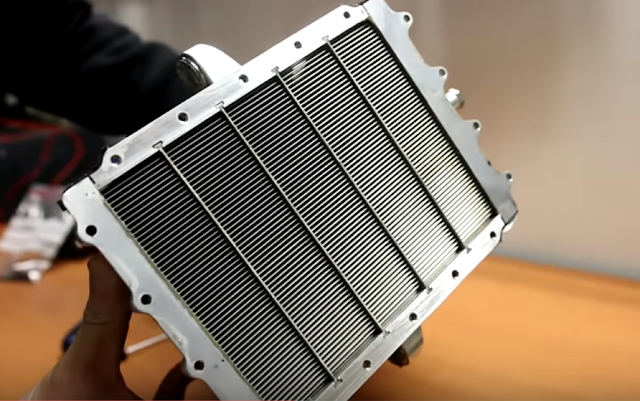 Ma la parte più interessante dello scambiatore posizionato tra la V del motore endotermico Ferrari 2014 e 2015 è sicuramente il lato acqua. Per poter garantire un migliore coefficiente di scambio termico, una maggiore leggerezza (lo carcassa dello scambiatore è in alluminio), e una sensibile riduzione dei volumi interni con conseguente riduzione di acqua da utilizzare (e quindi un minor peso posto in una posizione che potrebbe avere degli effetti deleteri sul baricentro della vettura) gli ingegneri del Team italiano avevano pensato di utilizzare le tecnologia dei "micro tubi".