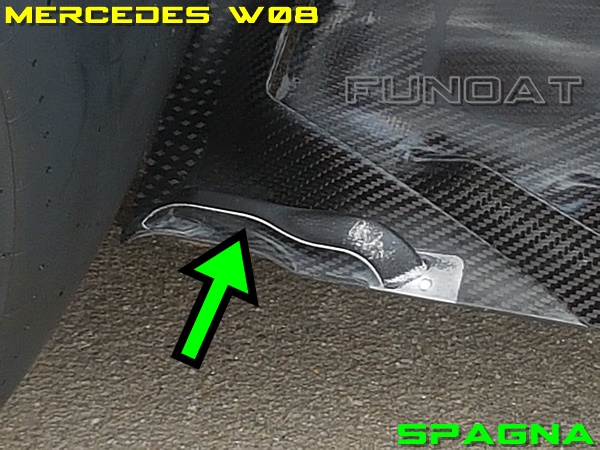 Durante la dodicesima trasferta di questo appassionante mondiale 2017 di Formula 1 si può però notare che il Team italiano ha ulteriormente modificato la parte terminale del proprio fondo. Come si può ben vedere è stato eliminato l'ultimo slot, a forma di J, sostituendolo con il prolungamento dell'ultimo slot a L oltre all'aggiunta di un piccolo "ricciolo" esterno indicato dalla freccia verde. Un "ricciolo" che come si può ben vedere dall'immagine poco in basso, assomiglia molto a quello introdotto dalla Mercedes in Spagna sulla sua W08.